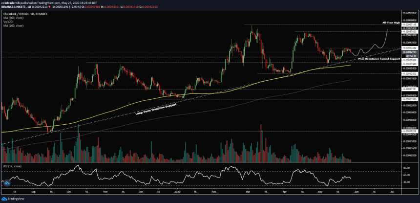 Although Chainlink is currently underperforming Bitcoin – trading down 2% against BTC at its current price of 0.000416 – this trend may soon come to a swift end.