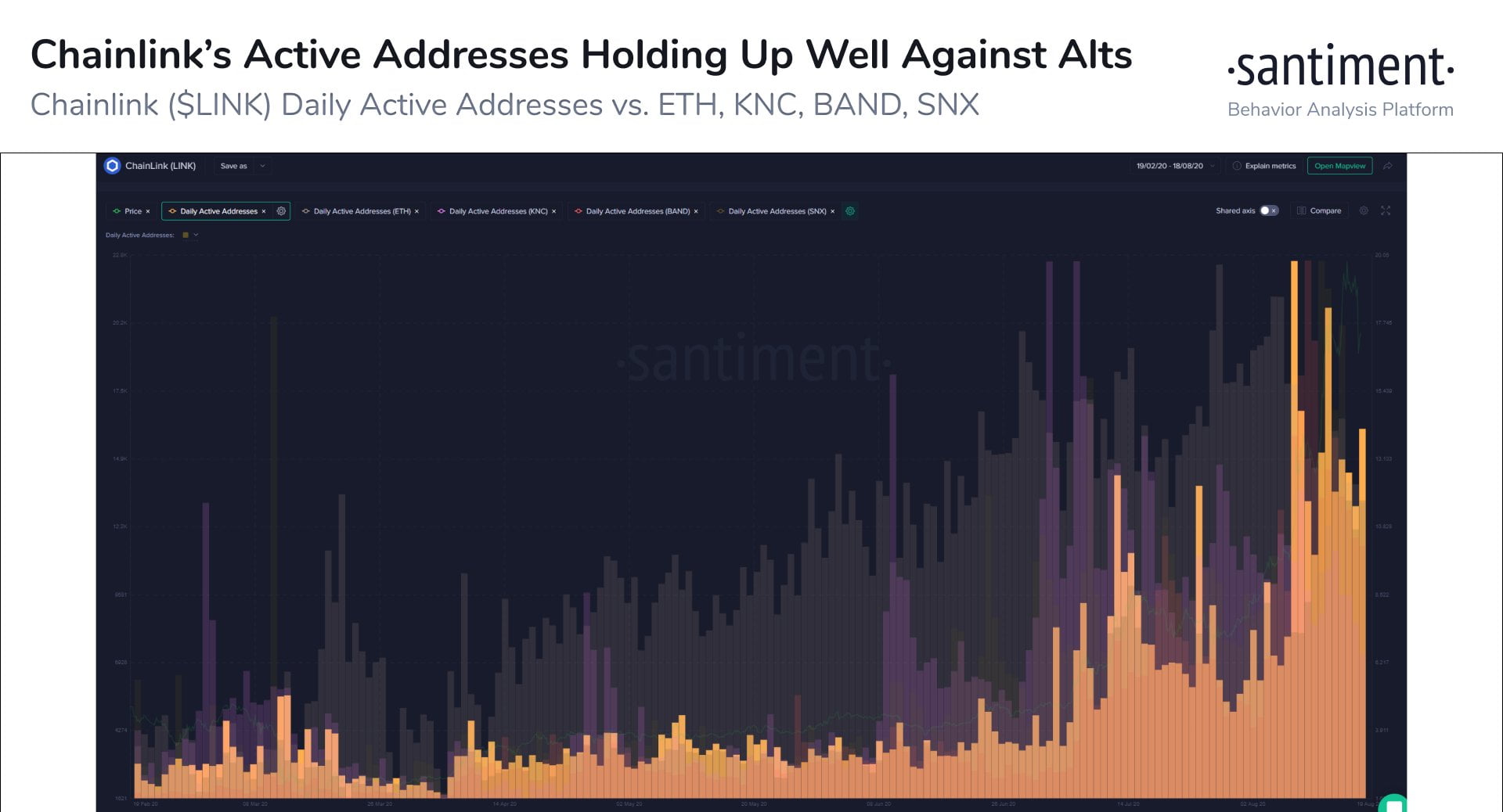 “LINK has held up well against altcoins this past day since its -16% Monday dump. A major reason is the fact that its unique addresses circulating transfers on the network has remained high compared to other alts.”