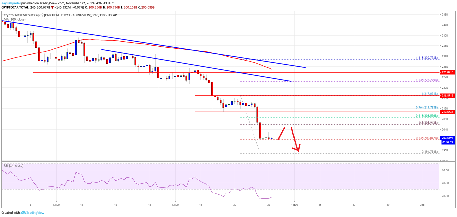 Looking at the total cryptocurrency market cap 4-hours chart, there was a sharp decline below the $210.0B support area. The market cap even broke the $200.0B support area (yesterday’s bearish target). It seems like there are chances of more downsides towards the $185.0B and $180.0B support levels in the near term.