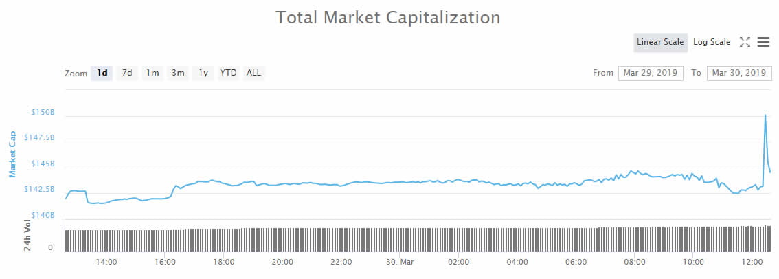 An ominous looking spike on the market cap charts may have obscured today’s price readings but generally markets have gained over the past 24 hours. Total cap is currently at $145 billion, up 2% from the same time yesterday according to CMC. Daily volume is pushing towards a yearly high as it approaches $40 billion and markets are looking in reasonable shape for a change with a clear up trend for the past two months.