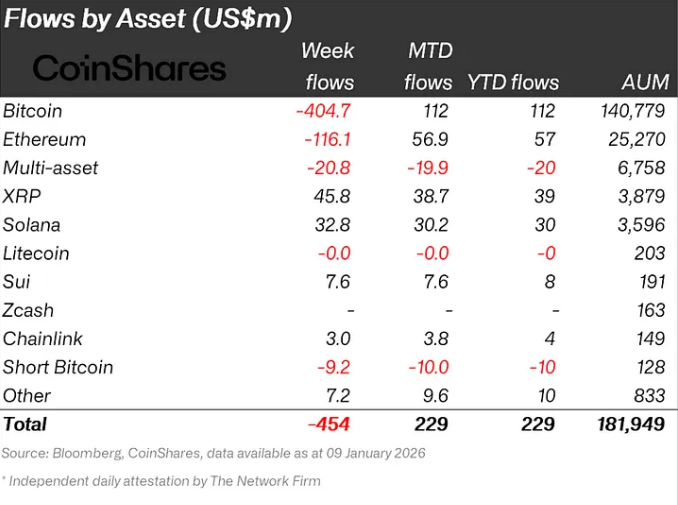 Bitcoin-linked products bore the brunt of withdrawals, with about $405 million leaving Bitcoin ETPs. Ethereum funds were also hit, posting roughly $116 million in outflows. Multi-asset crypto products reported net redemptions near $21 million.