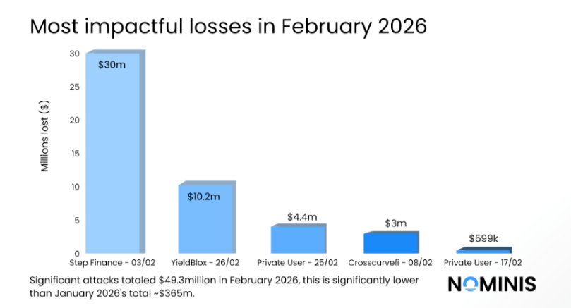A single incident accounted for most of February’s losses. Step Finance, a portfolio analytics platform built on Solana, was drained of approximately $30 million. Strip that one event out, and February would have been remarkably quiet by recent standards.