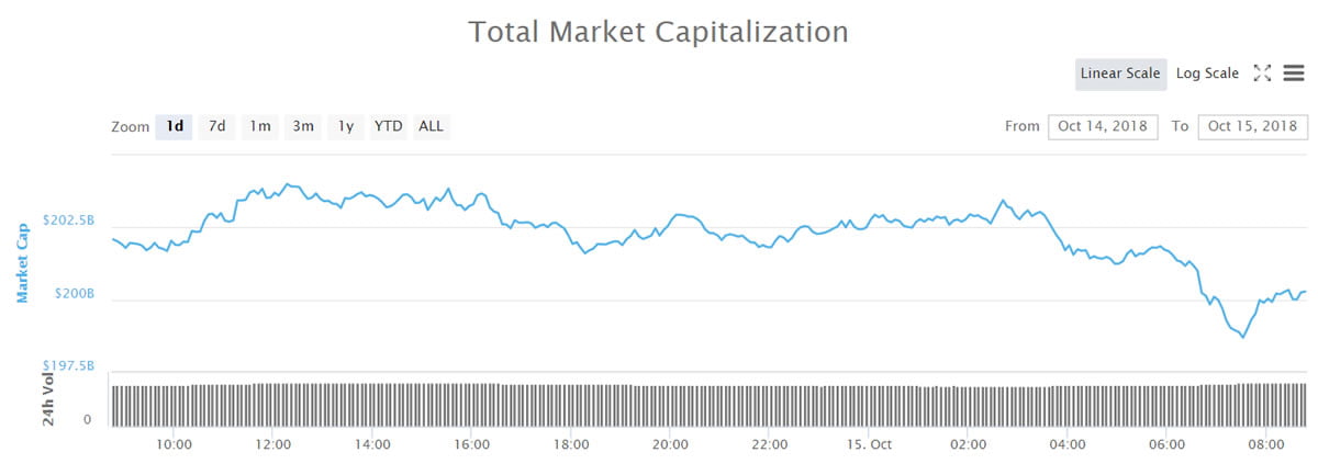 Total crypto market capitalization has fallen a further one percent during Asian trading this morning. Markets fell back to $198 billion but have recovered a little to climb back over $200 billion at the moment. Since last Monday crypto markets have lost 8%, and since the same time last month they are pretty much at the same level. Crypto markets have been at this bottom for around two months now, the longest inactive period since last year.