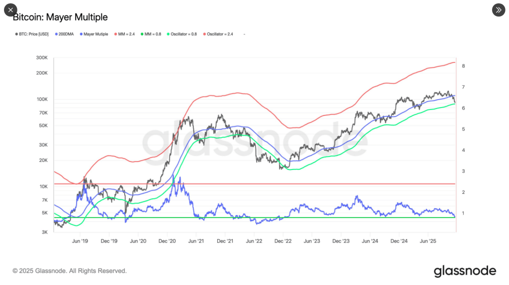 Based on on-chain indicators, there are mixed signals for buyers. Glassnode reported the Mayer Multiple moving toward the bottom of its long-term range, which often signals a value-driven phase where buyers re-enter.