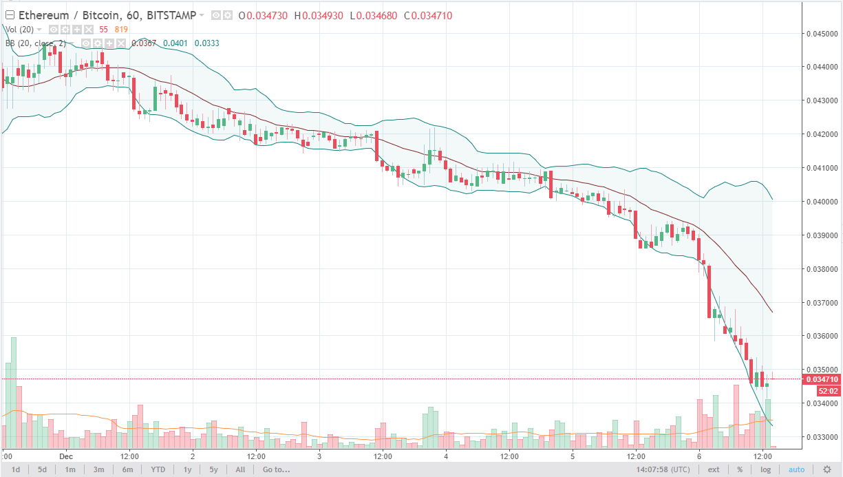 With all of that bullish pressure on Bitcoin, there’s no surprise here in the ETH/BTC chart, breaking down to fresh, new lows. I believe at this point using the 20 SMA on the hourly chart as dynamic resistance is the best way to go, shorting this market every time we hit the moving average. Where the bottom is, I don’t know, but quite frankly I am surprised that Ethereum has lost so much ground.