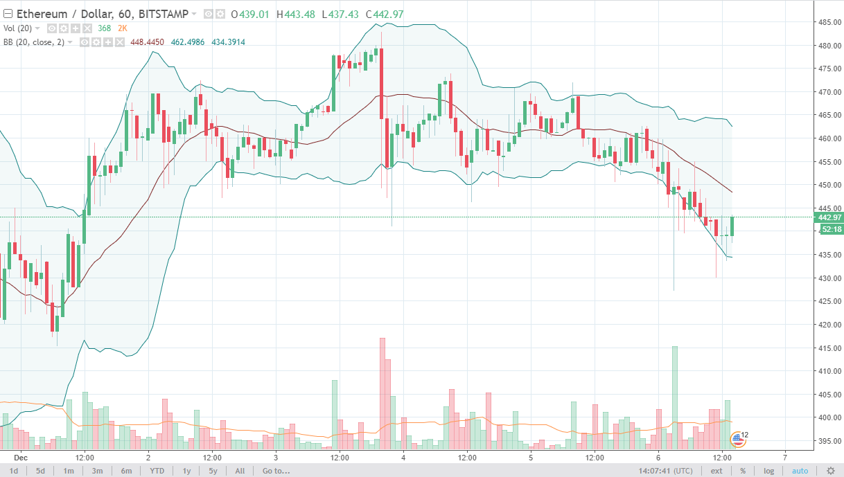 Ethereum fell during the Wednesday session against the US dollar, but is starting to find support near the $435 level. Currently, I believe that there is even more support closer to the $430 level, but a move above the $450 level should signify that the market is ready to continue to go higher. That being said, it seems as if most of the attention in the crypto currency world right now is focused on Bitcoin.