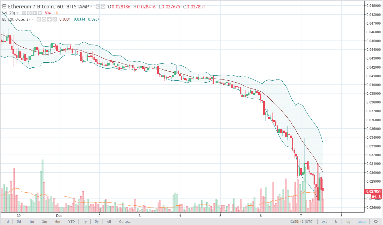 With Bitcoin making a new high every couple of hours, it’s not a surprise that this pair continues to fall. Simply put, every time this market rallies, it’s time to start selling again. The 0.03 level should be massive resistance, and at this point I don’t know where the bottom is.