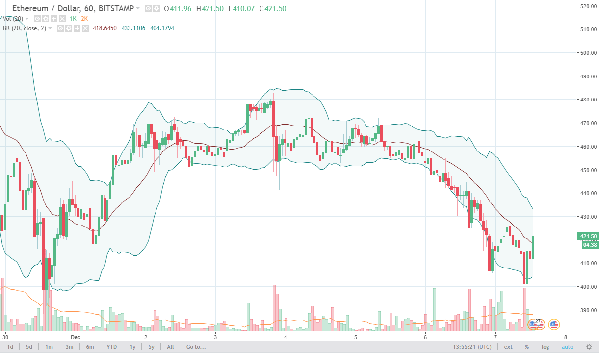 Ethereum fell during most of the trading session on Thursday, but found the $400 level to be supportive enough to cause a bounce. By looking at the chart, I see a cluster of trading activity near the $430 handle, so move above there has been bullish of Ethereum again, looking to reach towards the $470 level, possibly even the $480 level. A breakdown below $400 would be very negative.