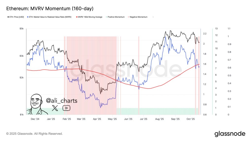 Nel grafico condiviso da Martinez, si osserva che il MVRV Ratio di Ethereum è recentemente scivolato sotto la media mobile a 160 giorni (160-day MA), a causa del recente calo di prezzo di ETH.