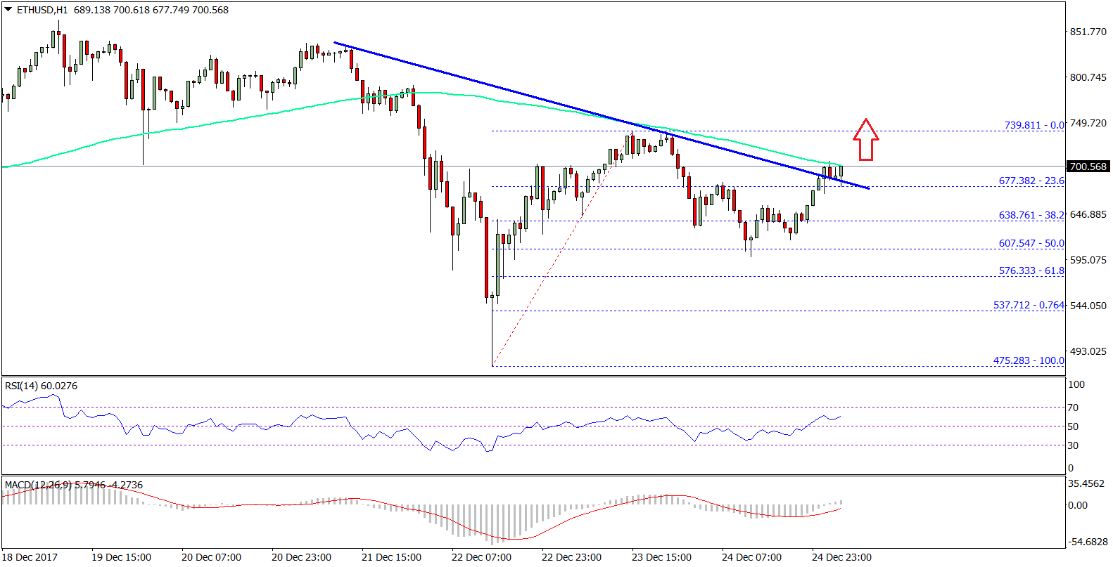 There was a complete test of the 50% Fib retracement level of the last wave from the $475 low to $739 high. It was a positive sign and after testing the $605 support area, the price started a fresh upside wave. It has moved above the $680 pivot and is slowly gaining momentum. During the upside move, there was a break above a bearish trend line with resistance at $670 on the hourly chart of ETH/USD. It has opened the doors for more gains and the pair has move above the $700 level.