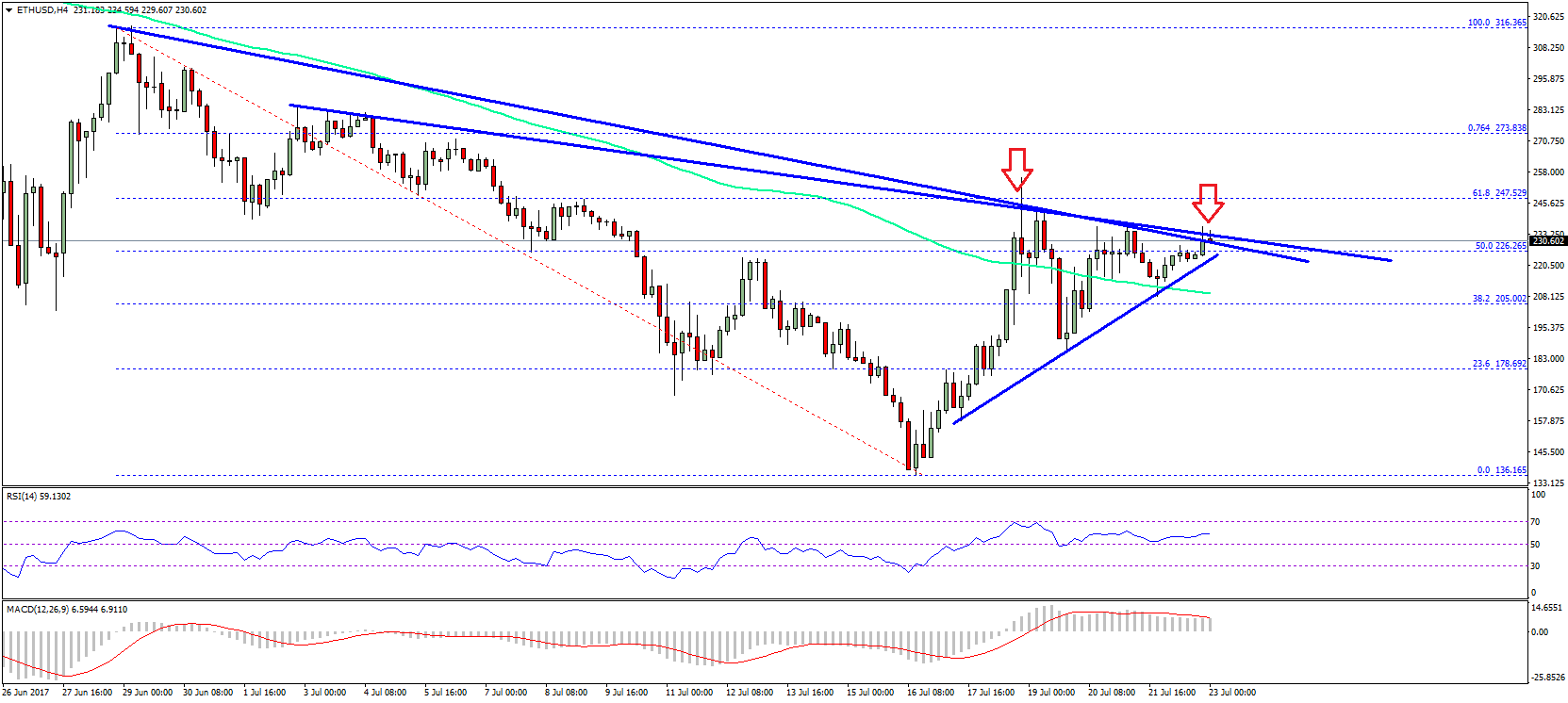 Later, the price was able to move above the 38.2% Fib retracement level of the last decline from the $316.36 high to $136.16 low and the 100 simple moving average (H4). At the moment, the price is trading near a major hurdle at $232-235. There is a monster contracting triangle pattern with resistance at $232-235 forming on the 4-hours chart of ETH/USD. The price is currently approaching a break and may most likely break the $235 resistance for a move towards $260.