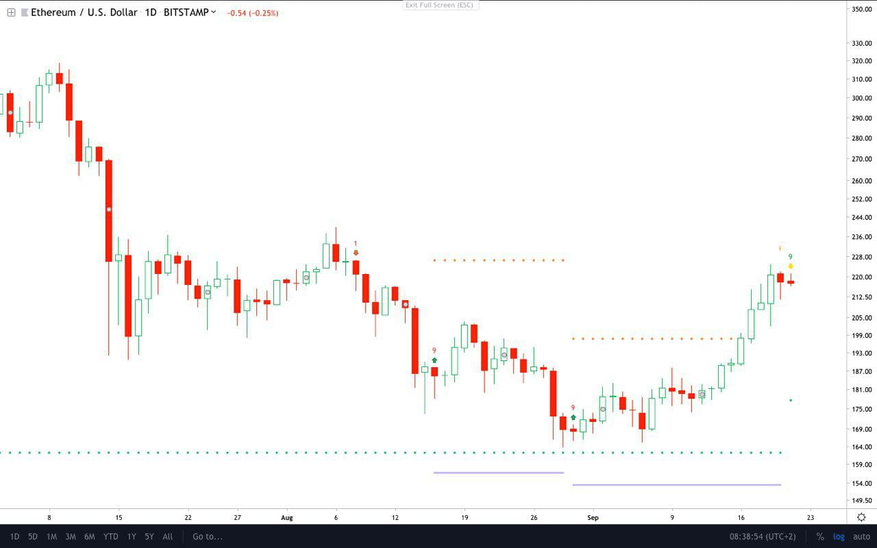 According to a Telegram alerts channel that tracks the TD Sequential indicator and how they apply to cryptocurrency trading pairs, the one-day ETH-USD chart recently printed a “sell 9” candle.