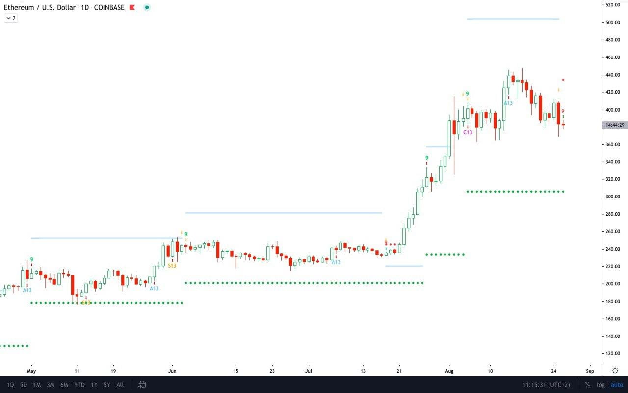 Chart of ETH's price action over the past few months with the Tom Demark Sequential from a Telegram channel tracking instances of the indicator. Chart from TradingView.com