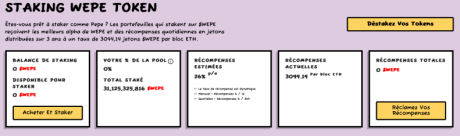Tandis que $DOGE est un simple memecoin qui repose sur sa position historique et sur sa très belle histoire avec le chien, représentant son image, $WEPE va bien plus loin. En effet, ce memecoin propose un mécanisme de staking, digne des plus grands projets de la finance décentralisée.