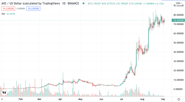 Axie Infinity's governance token, AXS, has been explosive this year as the platform crosses over 1MM active daily users. | Source: AXS-USD on TradingView.com