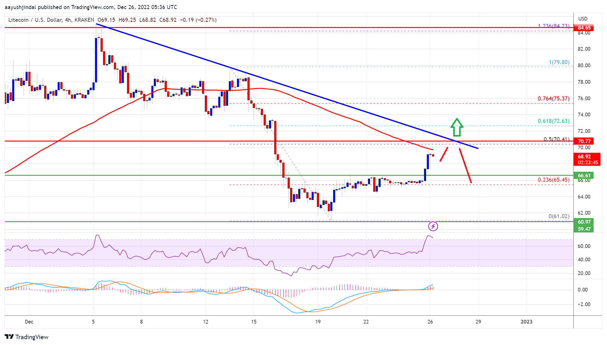 - There is a key bearish trend line forming with resistance near $70.50 on the 4-hours chart of the LTC/USD pair (data feed from Kraken).