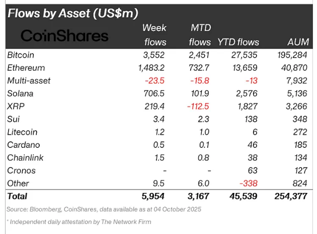Ether ETPs still registered strong interest, adding $1.48 billion and bringing year-to-date inflows for Ether to roughly $13.7 billion. Solana ETPs pulled in $706.5 million, and XRP products saw $219 million. These figures show that investors are putting fresh capital into a range of crypto products, even as BTC takes the lead.