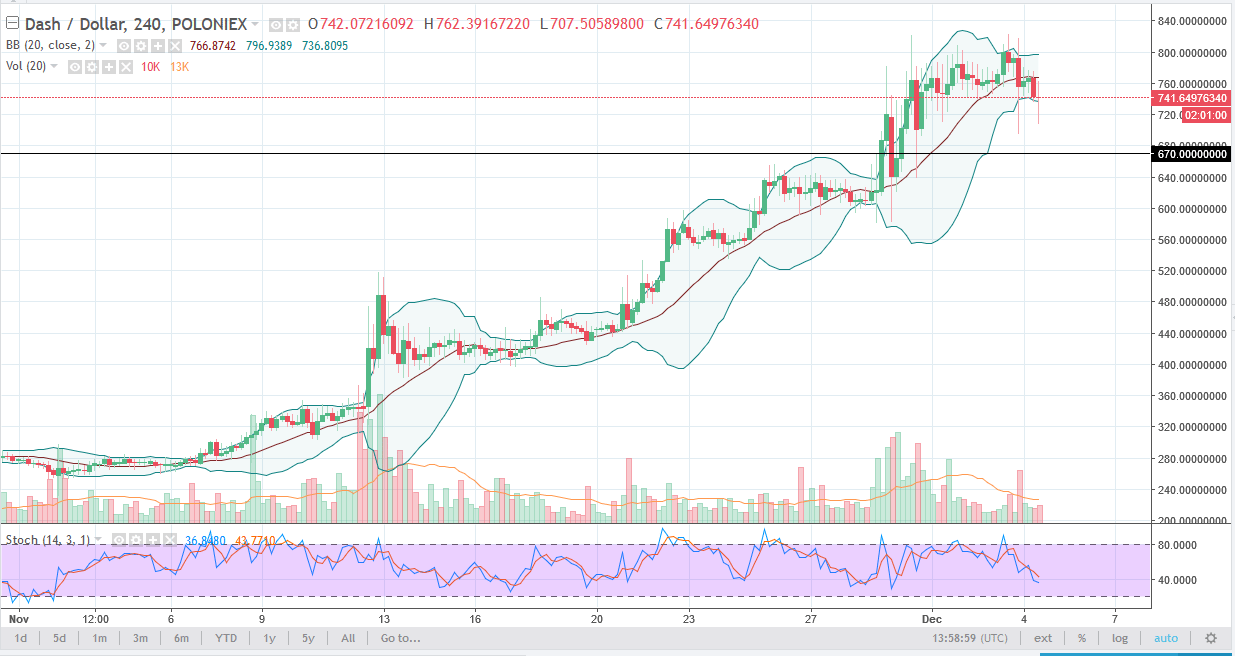 DASH continues to be choppy, hanging about the $750 region. At this point, it looks to me as if there is major support below at about $670, but we may not even get there. I do believe that a pullback is probably healthy, so I think that buying the dips makes sense. Watch the stochastic oscillator, if we get an oversold crossover, that could be further confirmation that we are ready to rally yet again.