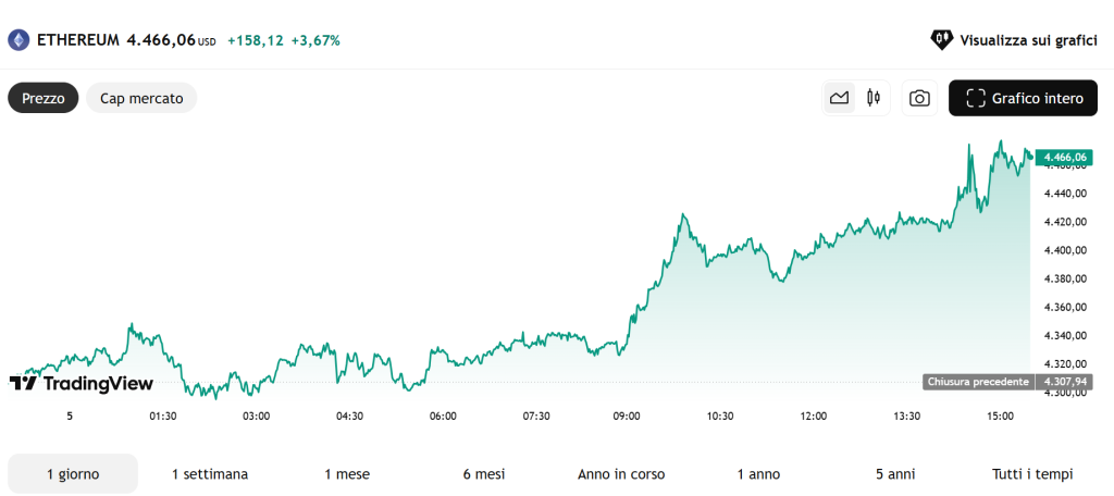 Ethereum viene scambiato intorno a $4.463, mantenendosi sopra la cruciale media mobile a 200 periodi (SMA), ma mostrando chiari segnali di indecisione.