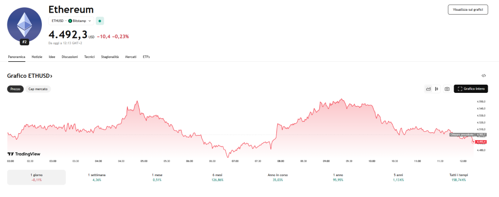 Al momento della scrittura, ETH viene scambiato a 4.492 $, con un aumento del 5% sulla settimana. Rispetto ai record, l’altcoin è ancora quasi 10% sotto il massimo storico.