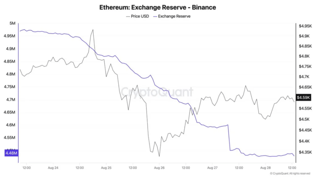 Nonostante la volatilità, i dati on-chain mostrano un quadro diverso. L’analista Darkfost ha evidenziato un forte calo delle riserve di Ethereum su Binance, scese di oltre il 10% in meno di una settimana: dai quasi 5 milioni di ETH a poco meno di 4,5 milioni. Una diminuzione così netta indica una forte domanda.