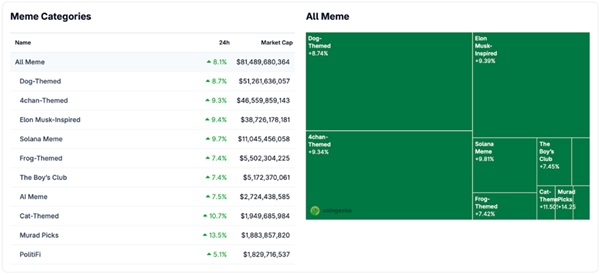 更廣泛的市場亦隨之上漲,週二錄得3.88%漲幅,並在週三歐洲開盤前再漲0.57%。動能迅速傳導至Meme幣,推動其總市值24小時內大漲8%,突破 810億美元,交易量在同一時期也達到 88億美元。