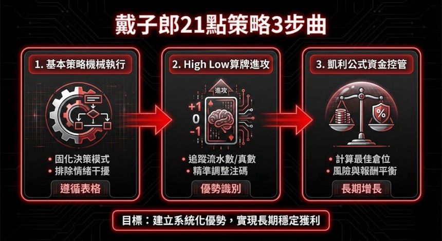 戴子郎能長期從賭場取利,關鍵並非「神準直覺」,而是嚴格執行一套以數學為核心的流程:把決策錯誤率降到最低,把優勢出現的時刻識別出來,再用注碼體系把優勢穿越短期波動並持續覆利化。