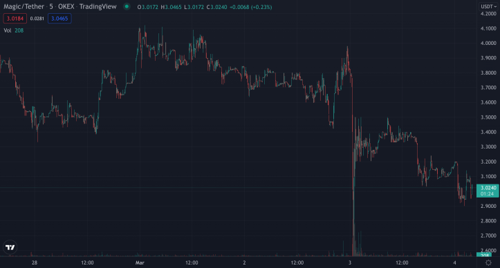 MAGIC is the native token on Arbitrum-based NFT marketplace Treasure, which saw substantial volatility in recent days following an exploit. | Source: MAGIC-USDT on TradingView.com