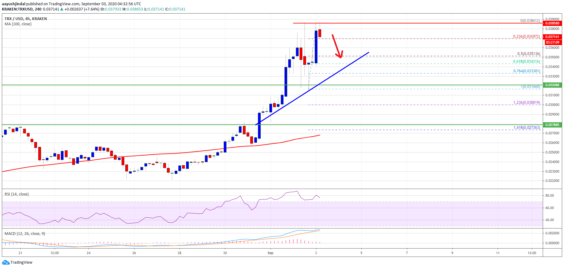 In the past few sessions, tron price followed a bullish path above the $0.0300 level against the US Dollar, and it outperformed bitcoin and ethereum. TRX even broke the $0.0350 resistance zone and settled well above the 100 simple moving average (4-hours).