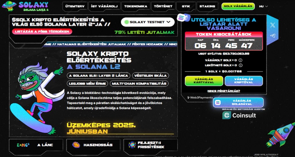 A Solaxy Layer-2 megoldásként fejleszti tovább a Solana sebességét, amely skálázhatóságot és Ethereum hálózattal való interoperabilitást kínál a Hyperlane híd segítségével. A Solaxy pre-sale során közel 42 millió eurót gyűjtött, és akár 88%-os éves hozamot kínál staking programjában, így kiváló lehetőség a növekvő nemzeti ökoszisztémák támogatására.