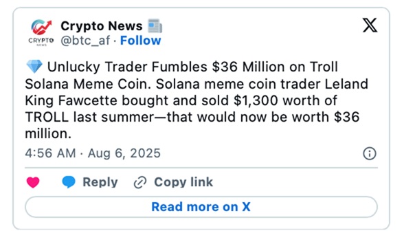 看看Leland King Fawcette的例子。去年,他以約1300美元賣掉了自己的TROLL持倉。當時,這個代幣的市值僅9000美元,看起來就是個不起眼的迷因幣,對吧?
