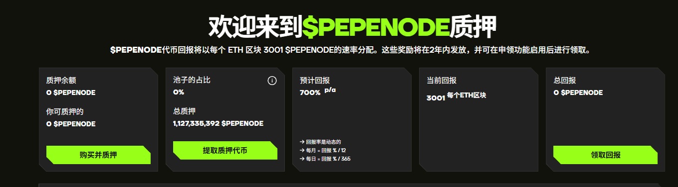 其次,PEPENODE的作用不僅限於遊戲內部。它還可通過專案的原生質押協議進行鎖倉收益,目前質押收益為 動態年化回報率約700%。