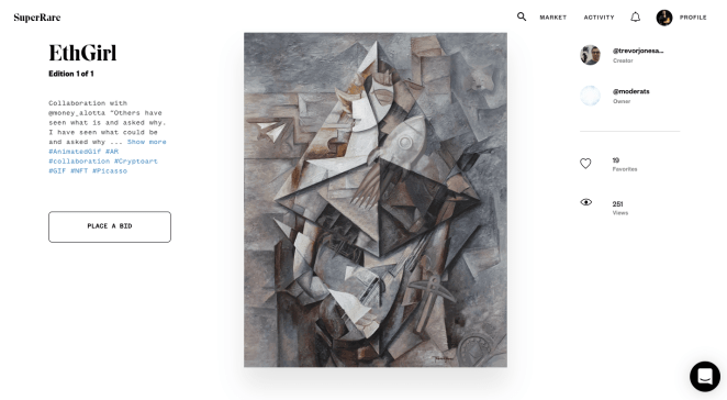 Hackatao, XCOPY, and Coldie are killing it on Superrare. Check out this transparent sales list, which by the way is also not something the art world is known for. In this article, Alan Smale interviews Whale Shark Pro about the process and evaluation he uses to pick up pieces. The collab of Money Alotta and Trevor Jones lifted to five figures for the Picasso inspired pieces with an AR function.
