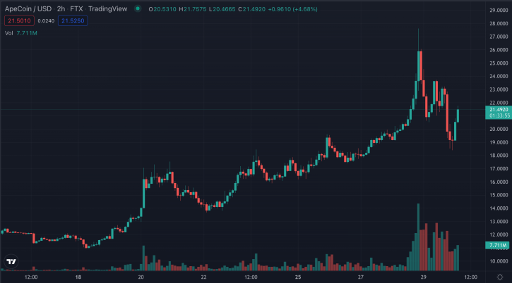 The APE token will be utilized in tomorrow's 'The Otherside' drop, leading to massive speculation over the token's potential price action over the days to come. | Source: APE-USD on TradingView.com