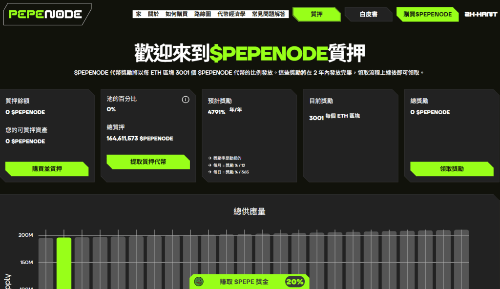 高額質押獎勵:PEPENODE允許你在取得代幣後立即質押,並承諾超過10,000%的回報。你能在官方預售網站的質押儀表板上追蹤獎勵累積情況,並在TGE後領取代幣與質押收益。預期隨著參與者增加,這些獎勵將逐漸下降。