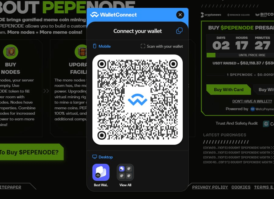 - 使用有信譽的非託管錢包來儲存加密貨幣。PEPENODE推薦Best Wallet、MetaMask與Coinbase Wallet,但任何支援WalletConnect功能的錢包都可以使用,讓你能連接到PEPENODE的預售。重點是錢包必須是非託管的,這表示你保有私鑰的所有權,並且你需對錢包的安全負責。