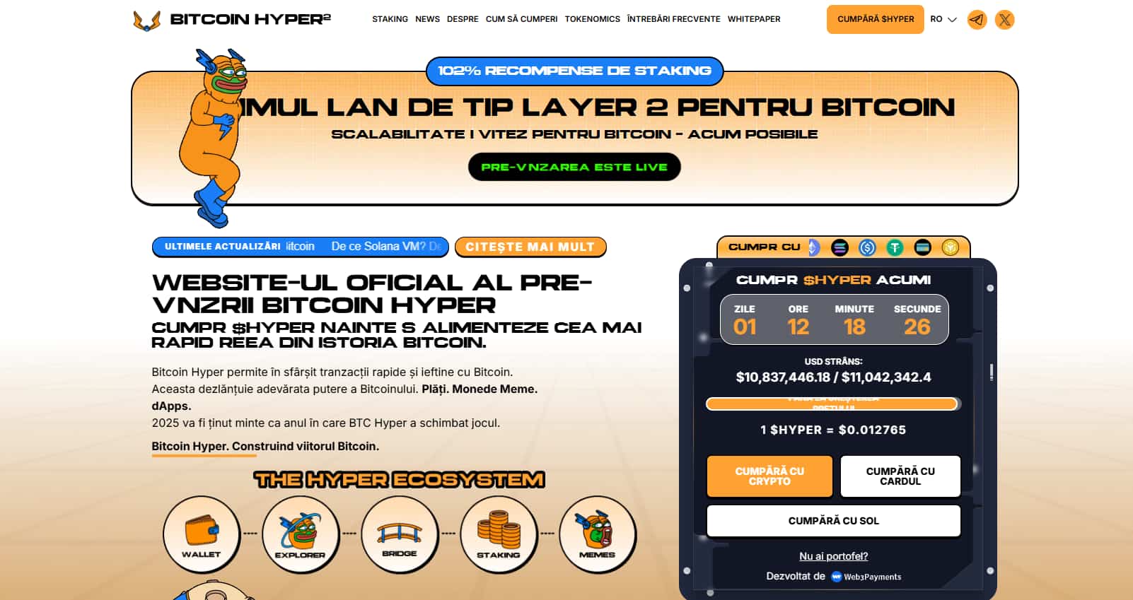 Deși nu este la fel de consacrat ca BTC sau ETH, Bitcoin Hyper (HYPER) este o criptomonedă emergentă care câștigă rapid popularitate. Funcționează pe o rețea blockchain modernă, optimizată pentru viteză și scalabilitate, având un ecosistem în continuă expansiune pentru dezvoltatori la nivel global.