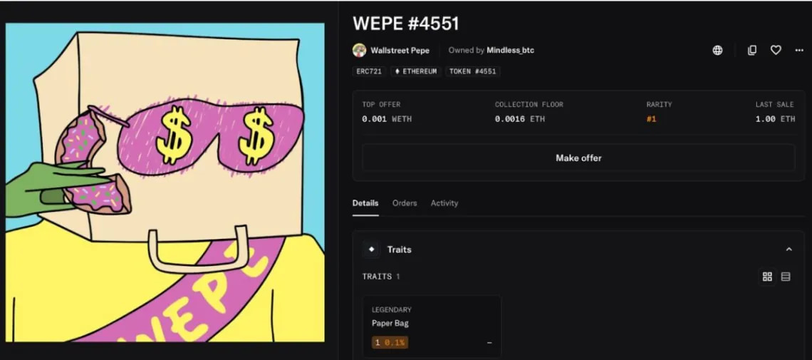 Activitatea de tranzacționare continuă să crească, cu un preț minim („floor price”) care a urcat cu 0,3% în ultimele 24 de ore și un volum zilnic de 0,07 ETH înregistrat luni. O tranzacție notabilă a fost vânzarea NFT-ului WEPE #4551 pentru 1 ETH acum doar două săptămâni.