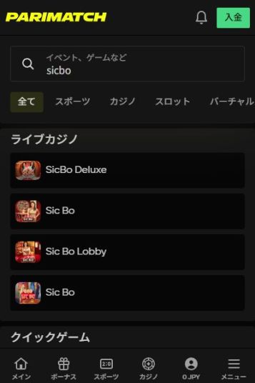 検索欄に「Sic Bo」と入力すると、搭載されているシックボーが出てきます。