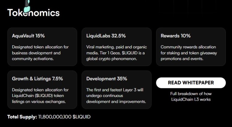 Community and adoption incentives are covered through 15% allocated to AquaVault for business development and community activations, alongside 10% reserved for staking rewards and ecosystem incentives. The remaining 7.5% is dedicated to growth and exchange listings, supporting liquidity provisioning and strategic market access as $LIQUID expands across trading venues.