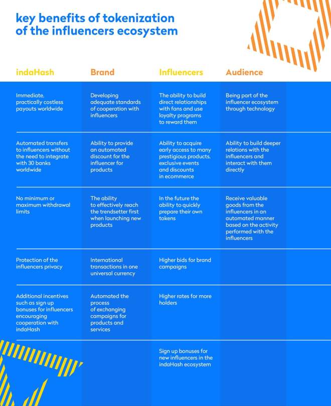 To tokenize the influencer industry in order to solve major issues between brands’ influencers and their audiences. Their crypto-economics implies circulation of the indaHash Coin among said groups and creates a new and more valuable type of relationship between each part of the ecosystem.