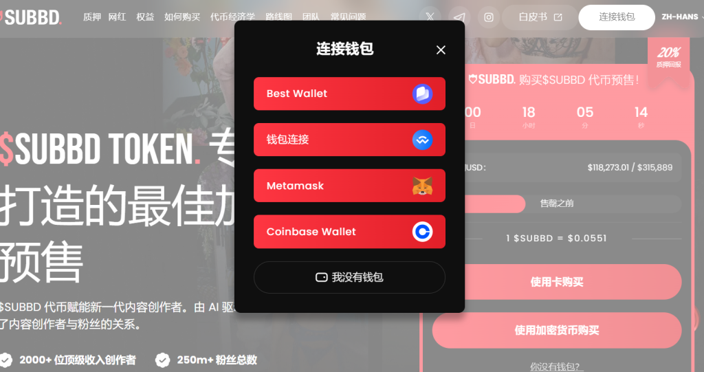 SUBBD($SUBBD)是一個新的預售專案,提供可接觸到擁有2.5億活躍追蹤者的AI創作者平台的機會。投資人可以在上架交易所之前購買$SUBBD,目前預售價格僅為每枚代幣$0.0564。